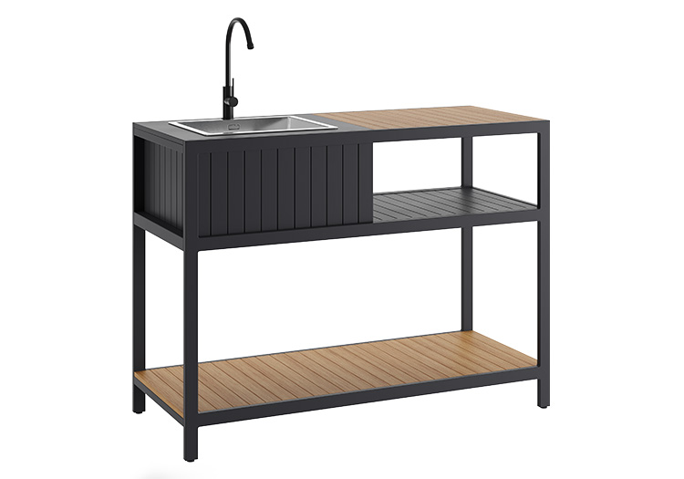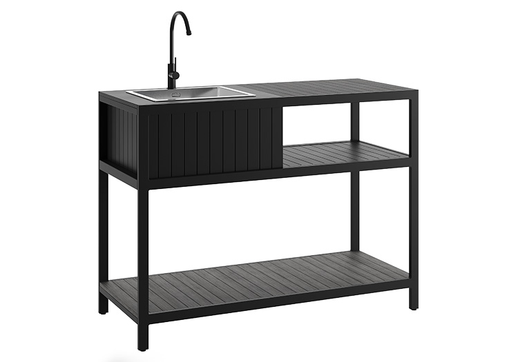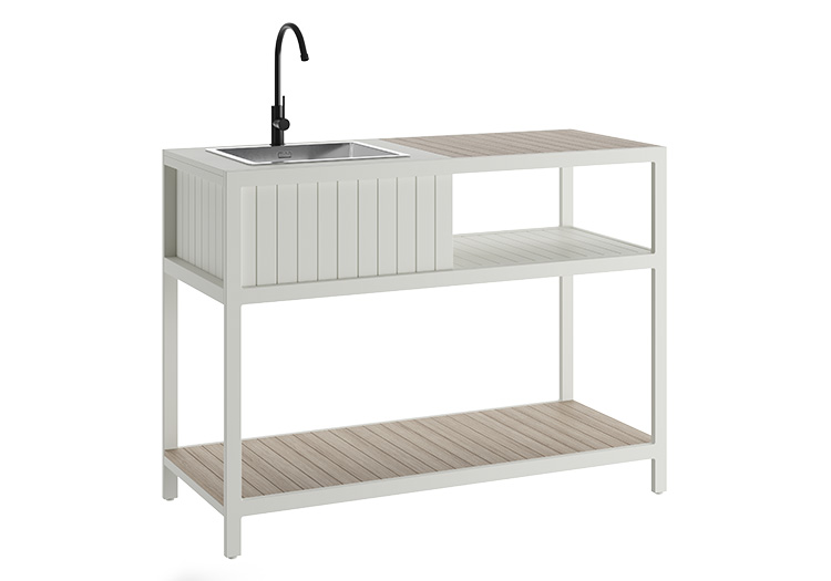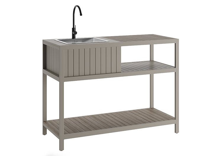 Our new outdoor kitchen range is made from powder coated aluminium and 100% recycled polywood. This sink unit features a high quality stainless sink, making it durable, hygienic and rust resistant. With generous shelving space underneath making sure that you have ample room to suit all occasions. Available in 4 colours to complete any garden style and the modular designs allow each customer to customise their outdoor kitchen layout.