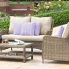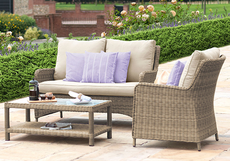 The Winchester square set uses a traditional weave creating a wicker look. The result is a deep texture fish with rounded corners for a more comfortable experience. This combination consists of a two seat sofa and two armchairs with a coffee table topped with toughened glass.
