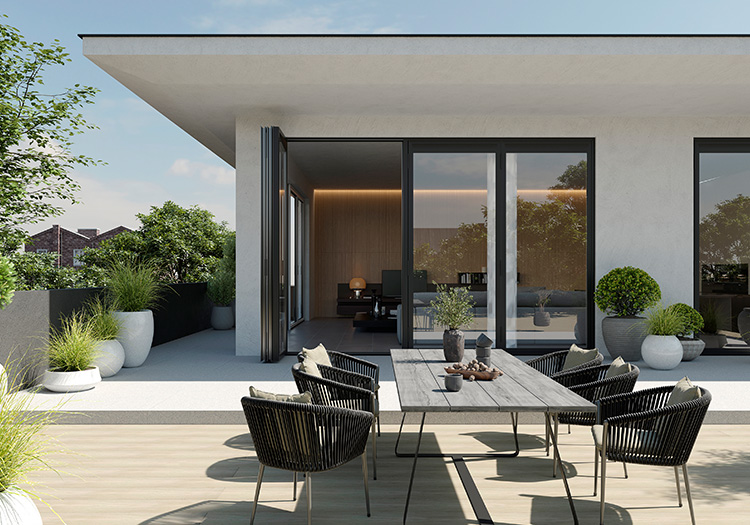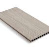 Ecoscape UK Grande decking has a dual surface finish with wood grain on each side: the front of the board is coloured in a toned ‘Chateau’, and the rear is coloured in the light-grey ‘Dovetail’ – a perfect alternative or accompaniment to stone or ceramic paving. At 9 inches wide (225mm), it really does provide a premium, contemporary finish.